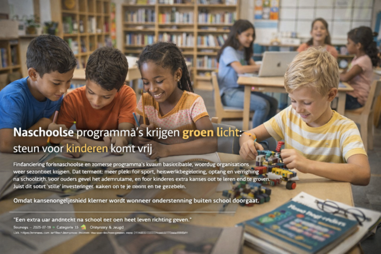 Kop : Naschoolse programma’s krijgen groen licht: steun voor kinderen komt vrijKorte samenvatting: Financiering voor naschoolse en zomerse programma’s kwam beschikbaar, waardoor organisaties weer zekerheid krijgen. Dat betekent: meer plek voor sport, huiswerkbegeleiding, opvang en verrijking na schooltijd. Voor ouders geeft het ademruimte, en voor kinderen extra kansen om te