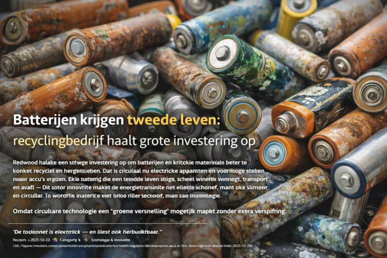 Kop: Batterijen krijgen tweede leven: recyclingbedrijf haalt grote investering opKorte samenvatting: Redwood haalde een stevige investering op om batterijen en kritieke materialen beter te kunnen recyclen en hergebruiken. Dat is cruciaal nu elektrische apparaten en voertuigen steeds meer accu’s vragen. Elke batterij die een tweede leven krijgt, scheelt nieuwe winning,