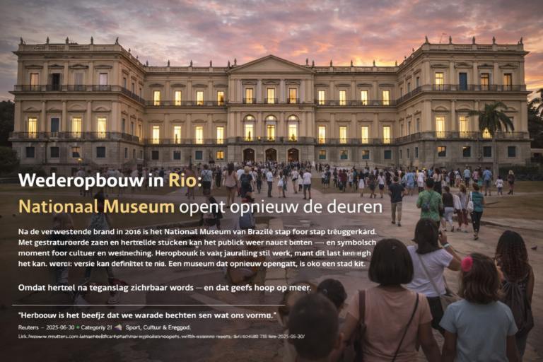 Kop (eigen): Wederopbouw in Rio: Nationaal Museum opent opnieuw de deurenKorte samenvatting (eigen): Na de verwoestende brand in 2018 is het Nationaal Museum van Brazilië stap voor stap teruggekeerd. Met gerestaureerde zalen en herstelde stukken kan het publiek weer naar binnen — een symbolisch moment voor cultuur en wetenschap. Heropbouw