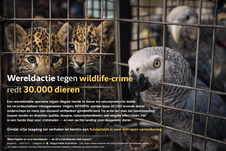 Korte samenvatting: Een wereldwijde operatie tegen illegale handel in dieren en natuurproducten leidde tot recordaantallen inbeslagnames. Volgens INTERPOL werden bijna 30.000 levende dieren onderschept en meer dan duizend verdachten geïdentificeerd. De actie laat zien dat samenwerking tussen landen en diensten (politie, douane, natuurautoriteiten) wél degelijk effect heeft. Het is een