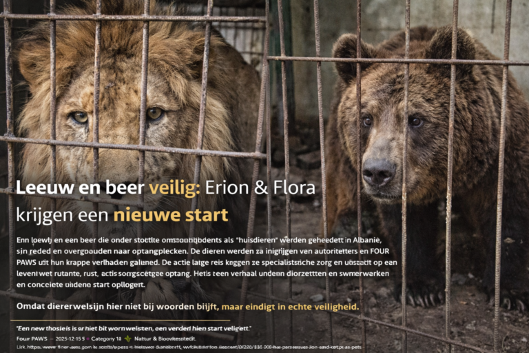Korte samenvatting: Een leeuw en een beer die onder slechte omstandigheden als ‘huisdieren’ werden gehouden in Albanië, zijn gered en overgebracht naar opvangplekken. De dieren werden na ingrijpen van autoriteiten en FOUR PAWS uit hun krappe verblijven gehaald. Na een lange reis kregen ze specialistische zorg en uitzicht op een