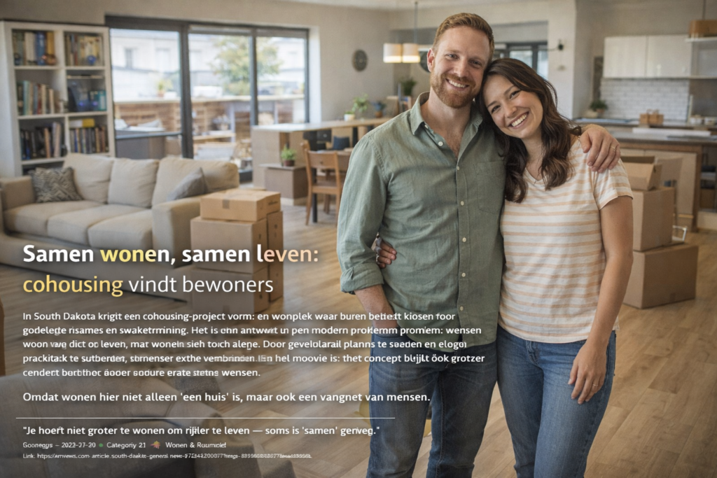 Korte samenvatting (eigen): In South Dakota krijgt een cohousing-project vorm: een woonplek waar buren bewust kiezen voor gedeelde ruimtes en samenwerking. Het is een antwoord op een modern probleem: mensen wonen vaak dicht op elkaar, maar voelen zich toch alleen. Door gezamenlijk plannen te maken en elkaar praktisch te ondersteunen, ontstaat er sneller echte verbinding. En het mooie is: het concept blijkt óók buiten grote steden te werken.